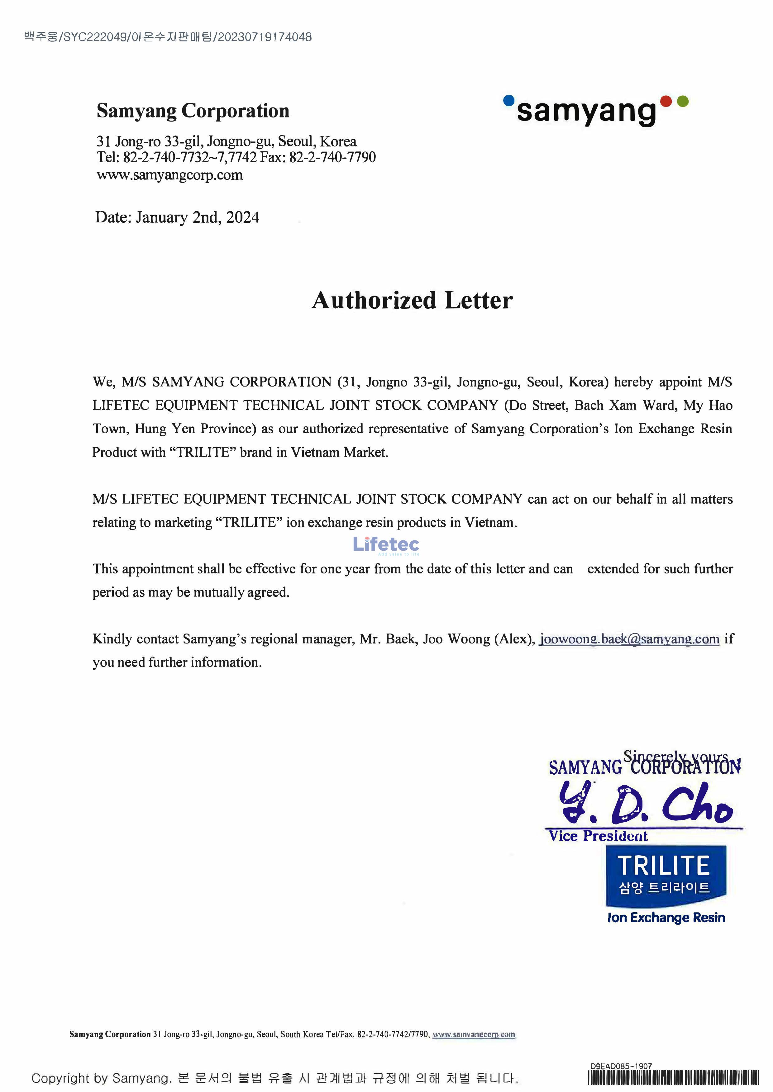 Thư ủy quyền phân phối từ hãng Samyang