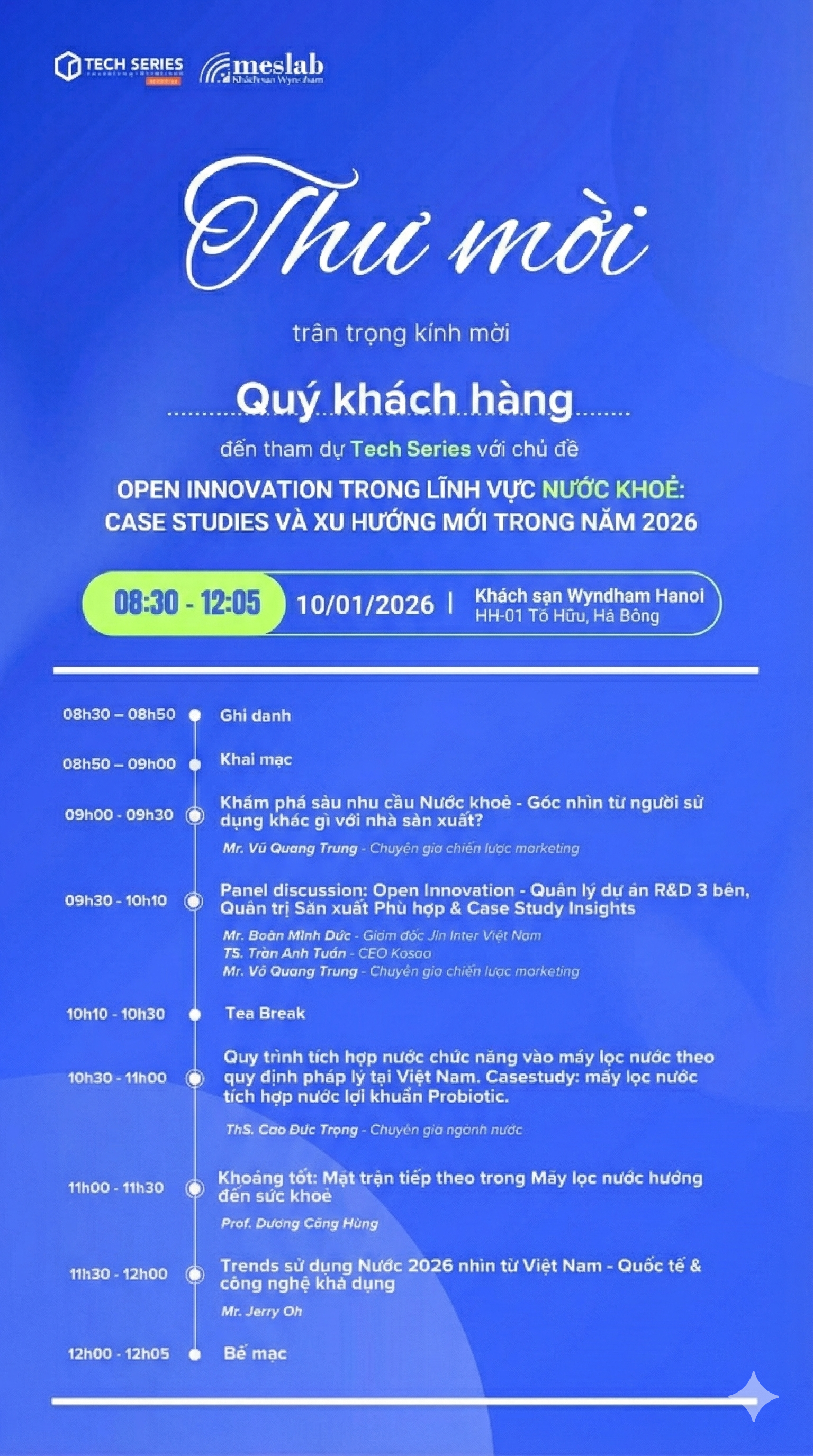 Tech Series 2026 là sự kiện chuyên ngành do Tech Series phối hợp cùng MESLAB – Industrial Innovation tổ chức, quy tụ các chuyên gia, nhà hoạch định chiến lược, nhà sản xuất và doanh nghiệp hoạt động trong lĩnh vực nước, sức khỏe và đổi mới sáng tạo.